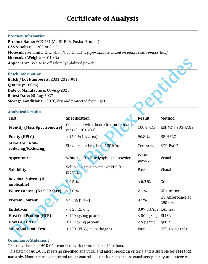 ACE-031 is a synthetic protein examined in laboratory research for its role in myostatin pathway modulation and cellular growth signalling investigation. It is studied as a modified analogue designed to interact with regulatory proteins involved in muscle growth control and tissue signalling balance. Within controlled research environments it is utilised to explore signalling mechanisms that influence cellular growth regulation protein expression dynamics and pathway inhibition models. Its defined molecular structure and receptor interaction profile make this a valuable research tool for advanced protein signalling studies.