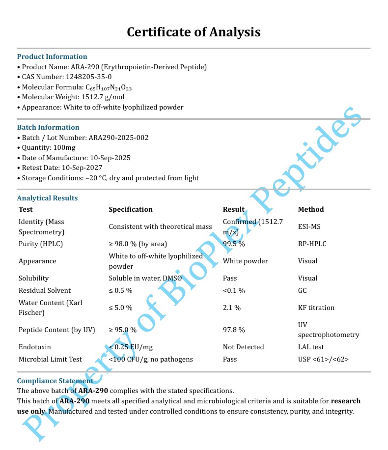 ARA-290 is a synthetic peptide analogue extensively studied in laboratory research for its role in selective cell signalling modulation and receptor mediated pathway investigation. Within controlled research environments ARA-290 is examined for its interaction with erythropoietin related receptor systems that influence intracellular signalling without engaging classical erythropoietic pathways. Its defined molecular structure and targeted signalling profile making this peptide a valuable research tool for studying cellular response coordination signalling specificity and pathway selectivity across complex biological systems.