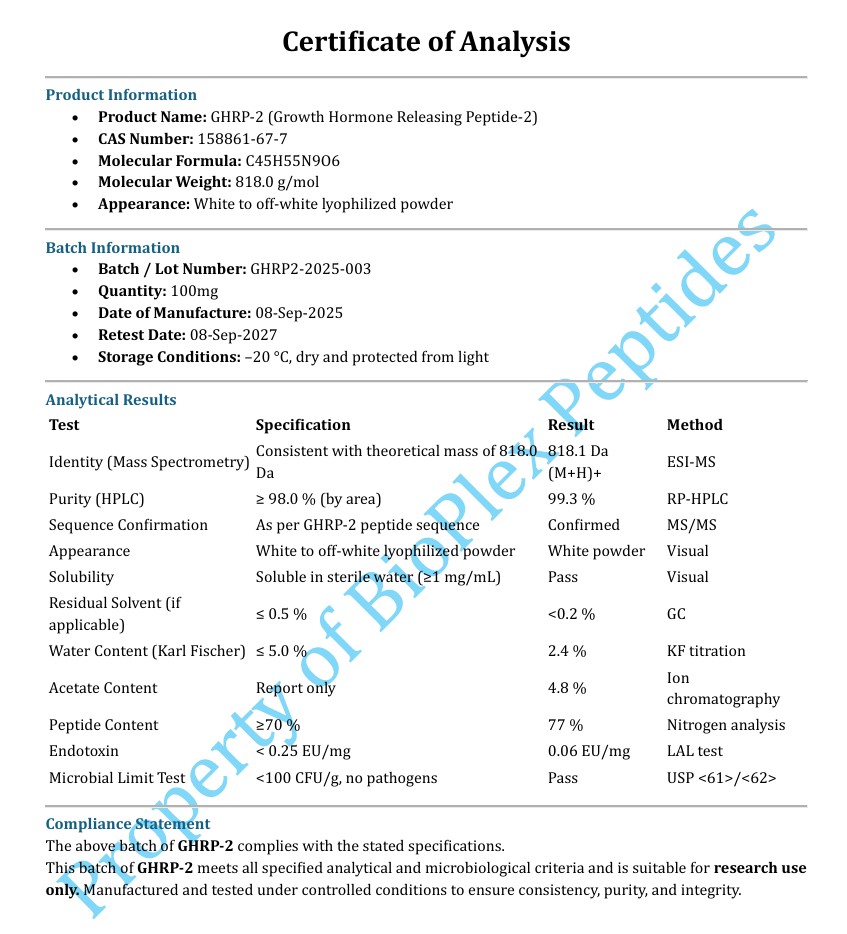 GHRP-2 is a synthetic hexapeptide widely utilised in laboratory and experimental research for its role in growth hormone secretagogue signalling and endocrine pathway investigation. Within research settings, it is studied for its interaction with ghrelin and growth hormone secretagogue receptor (GHS R) systems, providing insight into hormonal regulation, feedback signalling, and endocrine coordination. Its well defined molecular structure and consistent receptor engagement make GHRP-2 a valuable research tool for examining growth hormone axis dynamics, signal amplification, and receptor mediated endocrine modulation under controlled laboratory conditions. Scientific Background At the molecular level its functions as an agonist of the growth hormone secretagogue receptor (GHS R), a receptor extensively studied in endocrine and neuroendocrine research. Receptor activation initiates intracellular signalling cascades involving calcium mobilisation and secondary messenger pathways that regulate growth hormone release signalling. Research literature frequently references GHRP-2 in studies examining receptor sensitivity, signalling efficiency, and hormonal feedback mechanisms. Its relatively short peptide structure and predictable pharmacodynamic behaviour support reproducible experimental design and comparative peptide analysis across growth hormone related research models.