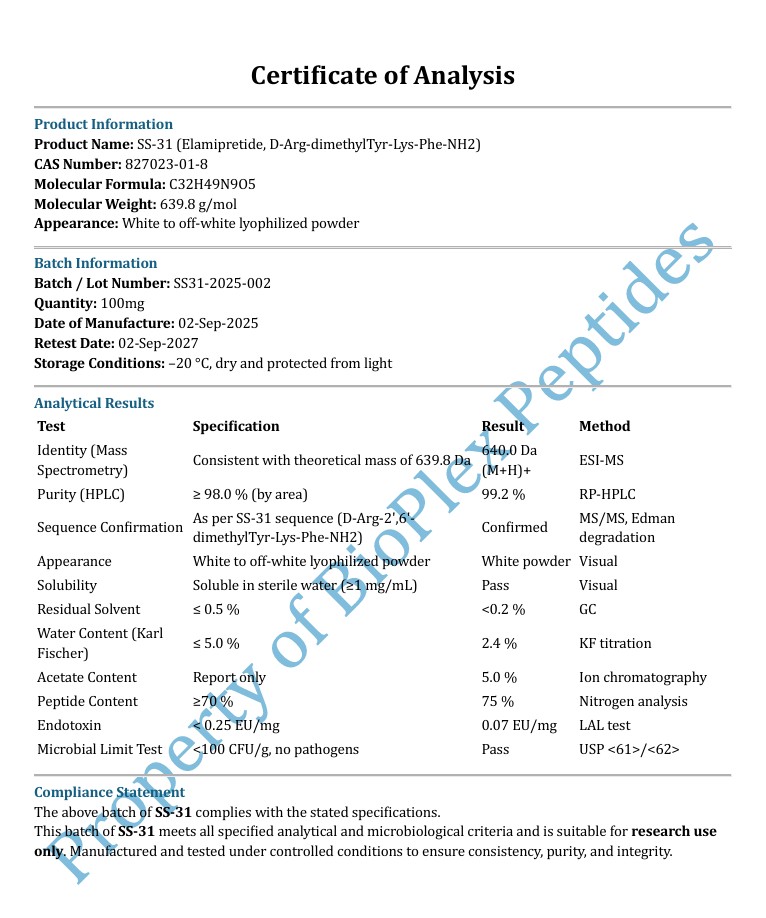 SS-31 is a mitochondria targeted synthetic peptide examined extensively in laboratory research for its role in mitochondrial function regulation and cellular bioenergetic signalling investigation. It is scientifically distinguished by its ability to selectively associate with cardiolipin rich regions of the inner mitochondrial membrane. Within controlled research environments SS-31 is utilised to explore how targeted peptide localisation influences mitochondrial stability energy production signalling and intracellular communication. Its defined sequence and mitochondrial specificity make SS-31 a valuable research tool in advanced metabolic and cellular energy studies.