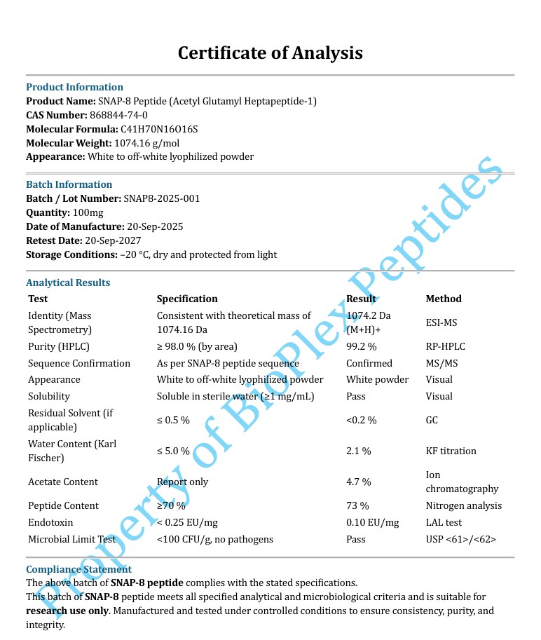 SNAP 8 is a short peptide fragment derived from SNAP-25 related sequences and is studied in laboratory research for its role in vesicle fusion and cellular signal transmission mechanisms. It is used to examine peptide mediated modulation of SNARE complex interactions and synaptic communication pathways. Provided in a lyophilised research grade format SNAP 8 supports precise handling reproducibility and consistency within controlled in vitro molecular and cellular signalling studies.