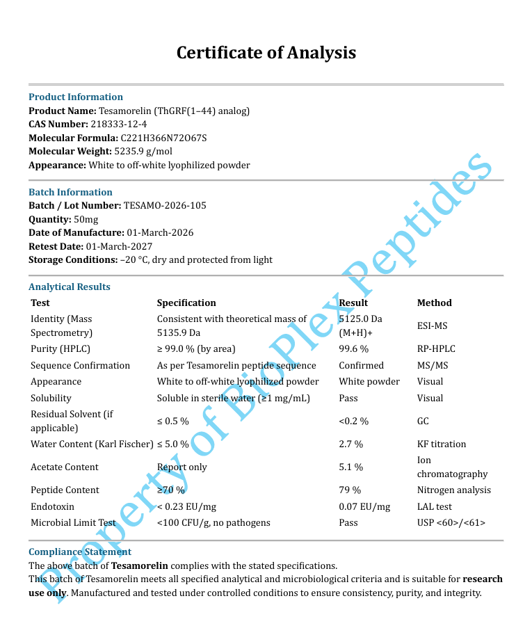Tesamorelin is extensively researched in the context of metabolic science, endocrinology, and age related physiological changes. One of its primary research applications involves the investigation of visceral adipose tissue regulation and lipid metabolism, as growth hormone plays a central role in lipolysis and fat distribution. In endocrine research, Tesamorelin is used to study growth hormone deficiency models, hypothalamic pituitary axis function, and GH-IGF-1 signalling integrity. Researchers also explore its effects on glucose metabolism, insulin sensitivity, and energy homeostasis, making it relevant in studies focused on metabolic disorders and body composition dynamics. Additionally, Tesamorelin is investigated for its potential influence on cellular repair mechanisms, protein synthesis, and tissue maintenance through downstream IGF-1 activity. Its ability to stimulate endogenous hormone release while maintaining physiological control systems makes it a valuable compound for long term studies assessing hormonal modulation, aging processes, and endocrine system adaptability.