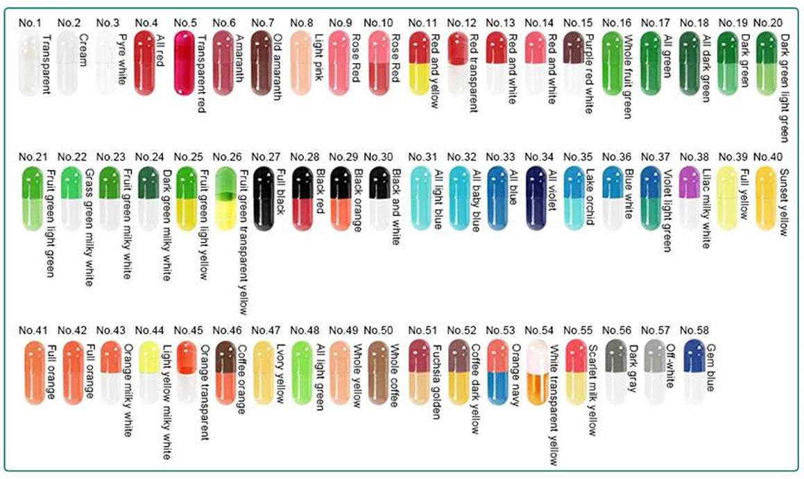 When ordering bulk quantities of SARMS (1,000 capsules) customers can choose their preferred capsule colour for each batch. This allows greater flexibility when selecting product presentation for different lines or listings. The chart below shows the available capsule colour options, and a different colour can be selected for each 1,000 capsules ordered.